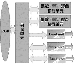 微指令在被执行前先存放在“重排序缓冲器(ReOrder Buffer,ROB)”中,一个分派单元或预约单元(Reservation Unit)将这些微指令分送到不同的执行单元(Execution Unit)中,执行单元同时从一级数据缓存(L1-D-Cache)取得所需的数据进行计算,然后将结果送回ROB和引出单元(Retire Unit),并被写到正确的寄存器中。