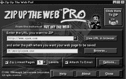 当在用Zip up the web Pro进行压缩下载时,可以选择保存文件的类型,保存以及将保存的网页取出浏览都非常容易(通过双击保存文件就可以进行浏览)。用户可以在压缩时,自动地让被压缩网页。通过缺省的电子邮件系统发送给其它用户(这种方法适用于孩子离父母较远的用户家庭),并且,用户还可以指定是否在压缩的网页中加入水印。为了随时知道给孩子看的网页是否为最新内容,可以在压缩的网页后面加入日期和时间,并在其中加入密码保护。
