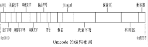 Unicode简言之就是宽字节字符集。在Unicode中,每个字符都固定使用两个字节来表示,这样一来,在字符串中只需简单地通过加减指针就能访问一个完整的字符。由于Unicode中字符都用16位(即两字节)的值表示,所以可以表示的字符最多有216=65536个,这样一来,几乎全世界所有书面语言所使用的所有字符都能被包含进来了。即使如此,所有的字母和符号加起来也才用了约35000个代码点,至今大约还有29000个代码点未被分配,保留作将来使用,这其中又有6500个位置是留供用户添加所需的自定义字符,一般是一些罕见的代表人名和地名的象形文字。Unicode的编码布局见图五。