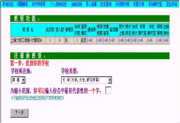 进入主窗口(如图2)后,从“注册新班级”下选择学校所在地和类型,单击下一步;接着选择学校名,输入入学年份,再单击下一步,系统就会列出该校该级已注册的所有班级;如果你的班级已经存在,就可以从表中选择;否则可以输入班级名称添加该班。以后登录后,就会在主窗口的“班级功能”下列出你所注册的班级名,你可以在本班留言,在本班、本校或本站聊天室中发言,根据个人资料或班级查询同学或校友等等,充分享受网上同学录带来的好处了。