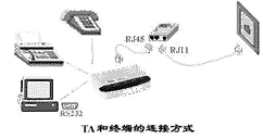 TA的连接方式如图3所示。一般TA具有与计算机相同的 RS232数据接口,可以直接连接到计算机的串行口。普通电话机和传真机则通过标准RJ11插头连接。