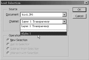 1”通道层(图11)。这时,在Tiger层上会出现选择区,试着按“Delete”键将其删除,这时颈部将会透出Eagle层的部分,产生渐隐效果。如果透出太多,可将选择区向下移,再删除,这样直至达到理想效果为止。