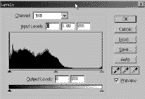 1.图片色彩调整:点击“Image/Adjust/levels”(色彩调整工具),进行灰度级的直方图变换,它能明显改变图像灰度级的分布(图2)。通过对Tiger及Eagle的调整,可弥补源图中的不足之处,如色彩亮度、饱和度等,最终达到理想效果。另外还有诸多色彩调整工具可供选择。