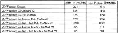 的性能 大多数的DIYer对于K7的速度性能应该是最感兴趣的,以前的K5和K6就吃足了大亏,因而其无论怎样标榜自己的各项CPU性能参数都不能掩盖一个事实,那就是AMD的CPU的浮点性能总是敌不过Intel的CPU的。不过,如今的K7已经旧貌换新颜了,表1是K7与PⅢ的技术参数对比。表2是第三方的评测结果,供参考。