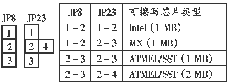 BIOS芯片的主板。查VTECH 82440LX主板说明书,得知BIOS 可擦写芯片类型跳线设置如下: