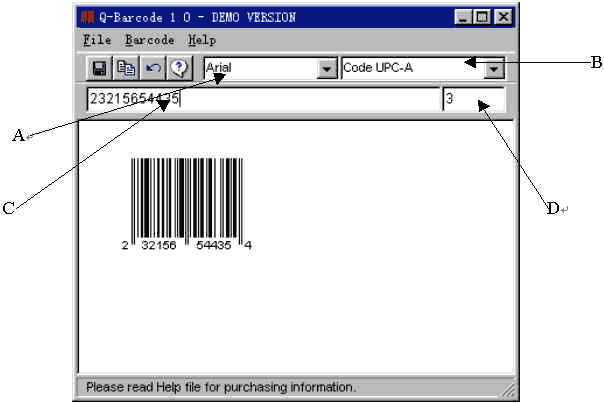 软件使用非常方便,只需在A处选择字体,B处选择条形码种类,1.0版的Q-Barcode支持EAN8,EAN13,UPC-A,UPC-E,CODE 39,CODE 2OF 5 INTERLEAVED,CODABAR,CODE 128(A,B and C),Postnet,Bookland(ISBN) and MSI PLESSEY(在以后的版本中,Q-Barcode将会支持更多类型)。接着在C处键入条形码的特征数字,如果还想多输入几位数字,可在D处键入2-5为数字。根据你所输入的数字,Q-Barcode会自动产生一个条形码,接着选取菜单“File”-“Save Barcode to File”将该条形码存为Bmp、Gif、Tif或Jpg格式,这样一个专业的条形码制作就算大功告成了。