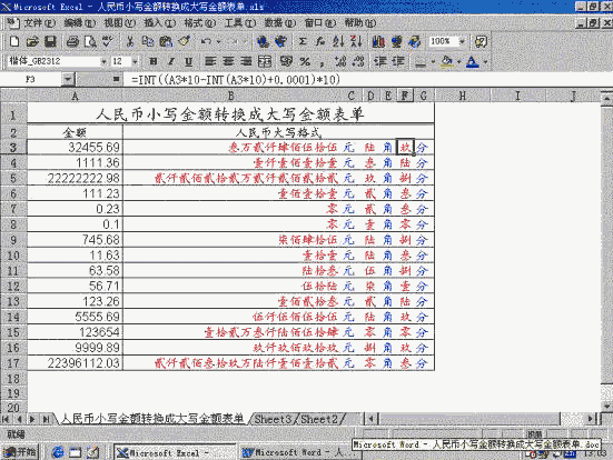(2)在单元格C3、E3、G3中分别填入元、角、分。