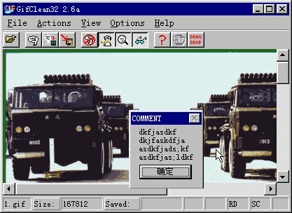 GifClean32这个工具使用非常简单,启动程序后,通过菜单“File/Open”打开一幅GIF图像,也可以用拖拉的方法打开,如果一幅GIF图像打开以后,程序会提示是否有清洁优化的必要,如果需要将一些多余的信息去掉,可以通过点击界面中的工具按钮来完成。例如,可以删除注释(第5个按钮)、删除无用的数据(第6个按钮)等。最后,可以点击“File/Save”或“File/Save as”保存。
