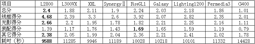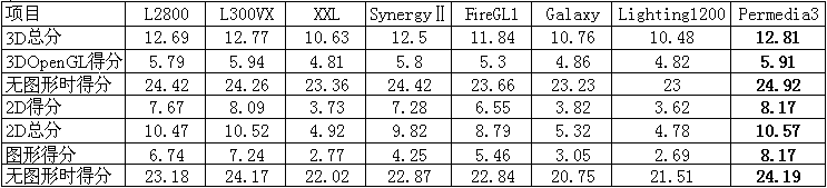 在第一部分的OpenGL测试中(得分见表二、表三),可以看到丽台L2800和帝盟FireGL1是Viewperf测试的佼佼者。因为L2800拥有几何加速芯片——Gamma,所以在反映线框速度的Light-03、DX-05、DRV-06测试项中优势明显,而号称256Bit加速卡的FireGL1则在反映动画与线框相结合的Awadvs-03、ProCDRS-02测试相中表现突出。Indy3D测试则是E&S公司Lighting1200和Galaxy的天下,E&S的这两块加速卡都拥有独立的纹理贴图芯片,所以在以动画、模拟为主的Indy3D测试中胜出也在情理之中。