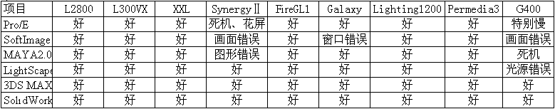 最后,我们还进行了兼容性测试。和我们以前进行的显卡与不同主板之间的硬件兼容性测试不同,专业卡的兼容性主要是指和各种高端图形设计软件之间的软件兼容性。可以想象,花了成千上万元买回来的图形加速卡在某个软件中不能用是多么令人懊恼的事。表八显示了本次测试样品的兼容性情况。撇开“非专业”的G400不谈,可以看出在专业显卡中采用nVidia TNT2芯片的ELSA SynergyⅡ兼容性问题较多,因为从本质上来说TNT2并不是针对专业应用设计的,要把D3D和OpenGL两种API完美地融合到一起并不是一件容易的事。SynergyⅡ能够达到这样的兼容性已经不错了。另外值得注意的是:我们在安装完Lighting1200专为Pro/E优化的驱动程序后,SoftImage和MAYA就不能正常工作了,所以专业显卡的用户在安装专门为某个软件优化的驱动程序时一定要注意一一对应,以免造成不必要的麻烦。