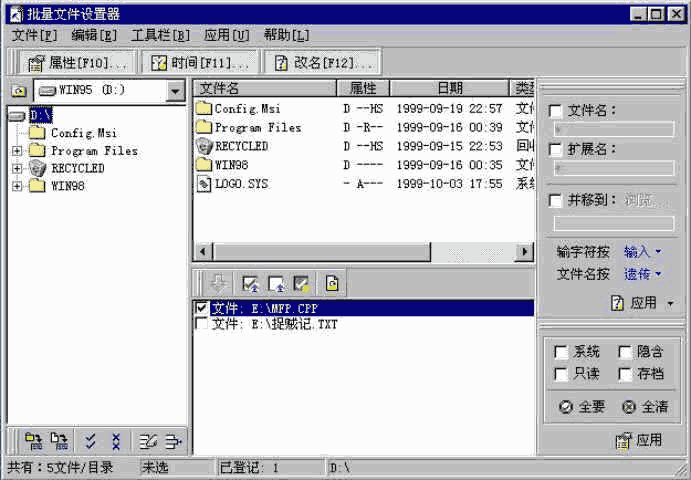 本领之二:属性修改。从光盘上复制来的文件要去掉他们的只读属性吗?一个一个的改掉又觉得太麻烦?找“批量文件设置器”就是了。不管是只读、存档、系统还是隐藏属性,随心设置、随意修改,方便之极。