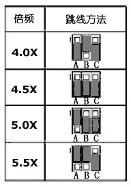 经过对主板的仔细寻找,我发现其外频的跳线有三组,据此轻而易举地找到了83MHz外频的接法,按照明书上的从1.5~3.5的接法,只使用了两对跳线,但主板上该处有三对跳线,难道是有所保留?一通排列组合以后,终于找到了从4.0~5.5的倍频的接法(如图1)。这么一来,这个主板的最高CPU频率从公开的75×3.5=262.5MHz达到了83×5.5=456.5MHz,这已足够支持现在的K6-2了。