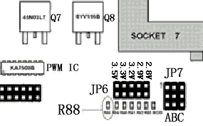 不管一晚的劳累,说干就干,拿出电烙铁,在头上用铜丝绑上一根绣花针,按照指示,焊下R88电阻,(位置如图2所示),千万小心操作,焊坏了我可不负责。实在不行的话,请个焊接高手吧。跳成2.2V(电压跳法见图3),用数字万用表一测, 2.204V!!!从电脑城买来一块K6-2 350,先不着急,用旧的K6开机,上网拉来最新的BIOS,升级,一切就绪。关机,换上新买的K6-2 350,电压当然跳成2.2V啦,频率么,先试试75×4.5=337.5(MHz) ,深呼吸,开机,自检信息过去后,显示