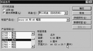 3.从该对话框中的“打印机信息”选项框中单击“激光和喷墨”,在“标签产品”框中单击右边向下的箭头,从中选择“Avery A4和A5幅面”,再从“产品号码”列表框中滚动列表,从中选取“L7413 - 名片”,这时在上图右下角的“标签信息”框中显示出此款名片的规格。