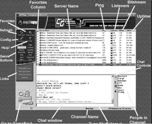 ●Chat Controls:在聊天框右侧有五个控制钮。自上到下按钮含义分别为(1)从当前所在的音乐频道退出。(2)你可以不退出当前所在音乐频道,而加入其它音乐频道的聊天室。这样你可以边听着某个频道下的音乐而加入到其它频道的聊天室中。(3)单击这个按钮 MP3SPY将打开选定的乐曲所在的主页。(4)与上面的按钮大同小异,只是锁定当前的聊天室而进入其它的音乐频道。(5)这是文件传输按钮,在People in the Channel中选择某个人后,单击传输按钮便可进行文件传输。