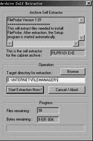 下载文件的大小除FileProbe较大(5917KB)之外,其余六个资源管理器都在1MB左右。七个资源管理器都需要进行安装才能执行,其中,Windows Commander 4.0 Beta 2、EF Commander 2.32 Build、WinNavigator 1.50、FileProbe 1.01.01和Turbo Browser 98 6.11必须解压缩后才能进行安装(如图1为解压缩FileProbe),Drag and File、Explor 2000属于自解压安装,不需要先解压。它们的安装过程都非常简单,只要指定需安装的目录即可。七个资源管理器经过安装后,都会在“开始”菜单中建立快捷图标。但只有Drag and File 、Explor2000、FileProbe和Turbo Browser 98支持在Windows 9X系统中卸载。