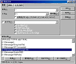 文件的查找功能也是资源管理器的主要功能。由于Explore2000和EF Commander本身没有内置查找功能,而使用Windows 的内核kernel32调用,所以它们查找速度与Windows 资源管理器一样,其余五个资源管理器都内置了查找功能。针对这些各具特色的查找功能,我们准备了包含490个目录(含多层目录O)共4712个文件来进行测试。为了得到更为准确的数据资源,这次也分别进行了10次测试,对其进行综合评比。根据我的测试结果,发现Windows 内置的查找功能相当强大,在我们指定的目录(包含4712个文件,490个目录)下查找所有文件时,Windows内置查找功能只用了2秒的时间,而采用内置查找程序的FileProbe的查找时间达23秒, Drag and File更甚,需32秒才能搜索完毕,不过,Windows Commander 4.0的查找功能相对其它内置查找程序的资源管理器(如图6),是最强大的,它搜索完指定文件仅用了5秒。由此看来,这些资源管理器程序在文件搜索上并没有获得Windows的核心技术。