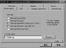 KeyGhost是一款由国人编写的软件,它的功能和Snooper差不多,但是增加了一些服务功能。在第一次运行KeyGhost时,需要对它进行一些设置,如上图(通过“Alt+F12”可调出主界面)。在这里面,你可以另外定义一下激活它的快捷键的方式,并为之加上密码保护。同时,你还可以决定它是否每次随Windows的启动而自动载入,并且希望它在多长的时间内有效,这一点是非常体贴用户的。因为你不可能一直都需要运行它,你可能只需要在你不在的时候用它。在“存储记录”中,你可以通过“调入”和“清屏”来查看记录和消除记录显示,并且你还能每次把这些记录储存在不同的文件里,以备后用。