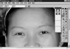 6.选取橡皮图章工具,配合橡皮工具、抹擦工具去除脸部的黑痣、疤痕及色斑等,将电脑融合得不好的部位加以修饰。选取画笔工具画上睫毛(见图7)。