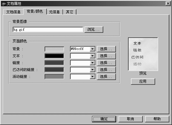 首先我们修改有关网页的文档属性,因为它会影响到我们对网页的整体感觉和了解,同时也可以反映出这个网页与众不同的个性和特色。选择菜单“编辑”-》“文档属性”调出修改文档属性的对话框,在“文档信息”页中,我们可以编辑文档标题,替换成所需的文字。用浏览器浏览此网页时,文档标题将被显示在浏览器的窗口标题条上。在“背景/颜色”页(如下图)中,按下“浏览”按钮,我们可以将背景图像更换成你所喜爱的图像,浏览网页时背景图像将会被平铺在浏览器窗口的背景上,就像桌面的墙纸一样。此外,我们可以分别指定页面背景、文本、链接以及已访问的链接、活动链接等项目的缺省颜色。按下项目右侧的“选择”按钮,可以在颜色选择框中选择您喜爱的色彩。同时,右侧的小窗口中可以预览各页面项目的实际效果。当按下预览窗口下方的“应用”按钮时,所设定的项目属性就应用到正编辑的网页上了。