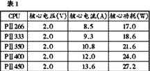 许多问题,换一个角度也许又有完全不同的解决方案。首先让我们了解一下CPU的发热以及增加CPU核心电压的作用。CPU的发热来自于CPU的功耗,即电能的消耗,而每秒钟电能消耗的多少(以焦耳为单位)是加在其上的电压与工作电流的乘积。首先应该注意的是,工作电流又往往随着电压的升高而升高,也就是说,CPU的功耗与加在其上的电压是近乎二次方的关系,因而,CPU的发热量是与电压值密切相关的,稍微降低CPU上的电压会有效减少CPU的发热量,从而可实现控制温度的进一步提升。其次,我们再注意一下不同工作频率下CPU的发热量。一般来讲,采用相同工艺制作的同系列产品,他们的额定电压是一样的,CPU的发热量差异也就主要表现在工作电流的不同了。在此以我们熟知的PⅡ系列为例(见表一)。