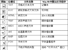 有关联程序的文件,大都以某个特征图标来表示是一个什么类型的文件,例如,一个TXT文本文件,就是用一个简单的笔记簿图形来表示。一个文件用什么图标来显示以及关联的程序,都是由Windows来管理。要注意的是,数据文件的图标是由专门的图标文件或关联的EXE文件提供(EXE程序文件的图标可以包含在文件中)。上表列出了Windows中默认的一些文件关联。