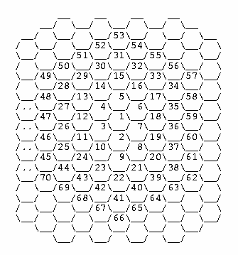 Unknown把一个“蜂房”编号为1,然后以它为中心,一圈 圈地按顺时针方向依次编号。如图:很明显:如果“蜂房”1要和“蜂房”2通信,直接联系即可,这样只要经过一个“蜂房”就可以了;而如果它要和“蜂房”20通信,可以按照路径1-2-8-20去联系,这样经过了三个“蜂房”(2、8、20)Dr. Unknown想知道任意两个“蜂房”之间通信最少要经过几个“蜂房”。现在,就请你编一个程序,帮他算一算。程序要求如下: