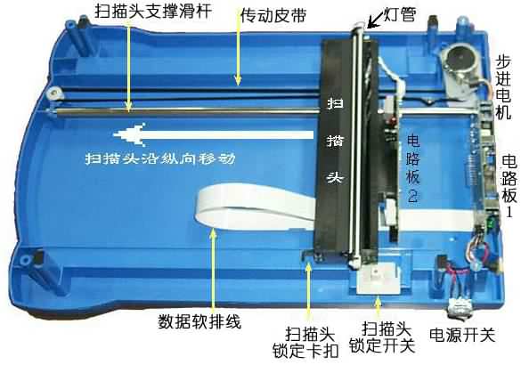 扫描仪整体为塑料外壳,由顶盖、玻璃平台和底座构成。玻璃平台用于放置被扫描图稿;塑料上盖内侧有一黑色(或白色)的胶垫,其作用是在顶盖放下时以压紧被扫描文件,当前大多数扫描仪采用了浮动顶盖,以适应扫描不同厚度的对像。如图1所示,透过扫描仪的玻璃平台,能看到安装在底座上的机械传动机构、扫描头及电路系统(电路板)。机械传动机构的功能是带动扫描头沿扫描仪纵向移动;扫描头的功能是将光信号转换为电信号;电路系统的功能是处理、传输图像。