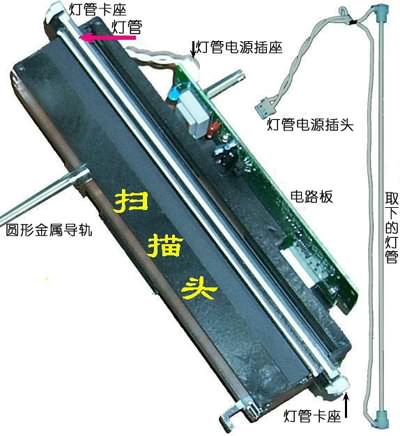 灯管在扫描头顶部,沿扫描头横向放置,卡在扫描头两侧的塑料卡座上,其供电电源插头插在扫描头后侧的电路板上。只需取下电路板上灯管的供电电源插头,即可从扫描头上取下灯管。最细的灯管只有火柴棍粗细,拆卸、放置时须特别小心。