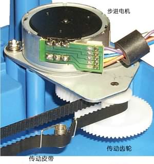 机械传动机构由步进电机、传动齿轮、传动皮带组成。扫描头由圆形支撑滑杆支撑,卡在传动皮带上,由传动皮带带动沿支撑滑杆移动,如图5所示。