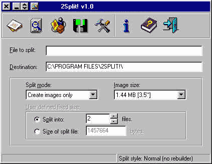 从评测数据上看,其性能指标与1toX 1.04相差极小。不过分割和合并有两个运行界面而没有集成在一起,使用上很不方便。安装时用户不能自定义路径,直接被放在C:\Program Files\2Split!\目录下,在追求个性和自由度的今天,多少会引起用户一定程度的反感。 八款分割工具中功能最为强悍,也是界面最不友好的一个(图3)。众多的功能和设置项使得它九个分页管理窗口大多显得杂乱、没有吸引力,仅有的几个图标也是重复、单调。内建720K、1.44M、2.88M三种分割数值。