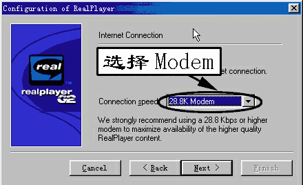 在该窗口中选择你的上网Modem的传输速率(图2),一般使用288K速率以上的Modem就可以得到较好的实时播音效果。点击“Next”。
