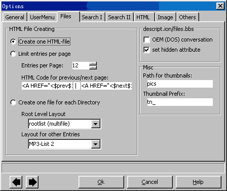 设定完毕之后点击文件(“Files”)标签卡,见图4。首先通过左面的选框设置所生成的HTML文件格式,三项选择分别为创建一个HTML文件、建立多页文件并限定每页文件目录项目数量、为每个目录创建独立的HTML文件。与此同时还设定了缩略图的路径名称与前缀形式。