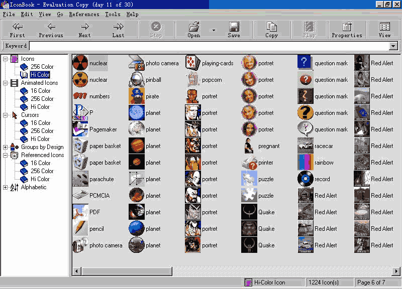 IconBook包括了25240个精美图标,提供了1362个关键词,保证在几秒钟内能找到你中意的图标。鼠标右击任何一个图标,会有一个浮动的菜单出现。点击“属性”,就能获得这个图标的类型、色彩数、来源以及关键词等信息;喜欢它的话,选择“另存为” ,就能保存为ICO、ANI、CUR和BMP等格式的文件;如果是动画图标,还会多出个“播放”,在播放的过程中可以动态调整每秒帧数和改变背景色。让IconBook搜索指定目录下的ANI、CUR、DLL、EXE、ICL和ICO文件或者前面任何一种格式指定文件中的图标,然后加到索引图标里面去,添上自己的关键词,这下你总算对满硬盘乱七八糟的图标有个交待了。当然你也可以选择“另存为”,把DLL、EXE和ICL文件里的图标抽出来,是不是挺像IconExtract?这还没完,IconBook还内置一个小巧玲珑却又功能不俗的做图标的小东东——IconCreator,它能将BMP、JPG、GIF和WMF格式的图形文件或者剪贴板里的文字、图形转换成图标,设定透明背景,结合图像处理软件就能做出专业级的图标。