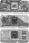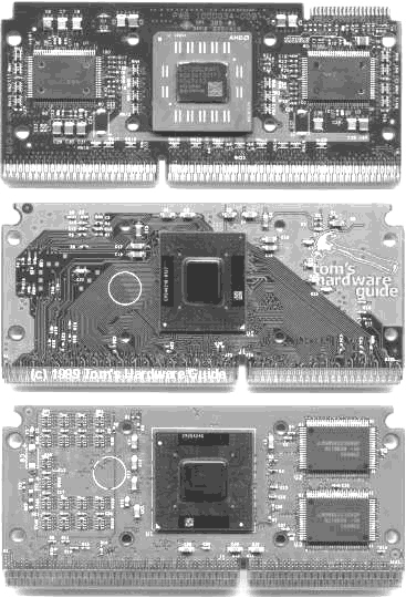 新的Coppermine处理器看起来和老PentiumⅢ(代号Katmai)有些相似(见下图,从上到下依次为Athlon、Coppermine和Katmai),不过你会发现,在PCB板上找不到二级缓存。原来,它的二级缓存是集成在处理器中的!像赛扬,这可能是你的第一反应,不过,Coppermine的二级缓存是256K,而赛扬只有128K。不仅如此,它在技术和性能上都有长足的进步。Coppermine处理器的金属层使用了静态铝工艺,同Athlon相同。