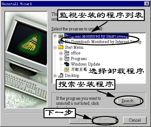 提示:有些程序最好不使用CleenSweep卸载,如IE浏览器、Office 2000、Norton工具箱、Microsoft Plus!等。