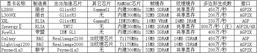 因为用途不同,专业图形加速卡和一般3D加速卡在硬件和软件上存在很大的区别。在硬件方面,TNT2一类的3D加速卡几乎所有的功能都集成到一块主芯片中,而许多高档专业卡上有四五颗芯片,其RAMDAC、渲染芯片、显示芯片都是独立的。例如ELSA的老牌专业卡Gloria