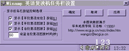 当WinAmp处于播放状态时,鼠标单击任务栏上的图标3,从当前的播放位置倒退已设定的自控复读回放时间处,开始自控复读回放,并以此时间为间隔自动向前延伸出多个(最多10个)自控复读回放位置,供连续自控复读回放用。用鼠标右键单击任务栏上的图标,则从最后的一个自控复读回放位置开始复读回放,用鼠标右键每点击一次该图标3,则从更前一个自控复读回放位置开始复读回放,一直循环复读。另外,下载文件压缩包中有更详细的说明文件。正在为练习听力而苦恼的朋友,或者想用来练习唱歌的朋友,可以去网上拉一个来试一试。