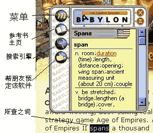 运行Babylon后,系统栏就显示了Babylon的图标。左键单击图标,可以暂时停止Babylon的使用,右键单击可以调出设置菜单进行设置。Babylon的使用和《金山词霸》有些差别,用鼠标指到屏幕上的某个英文单词,然后激活Babylon,例如:如果你设置的是“右键单击”激活,单击鼠标右键,就可出现该单词的英语解释,主界面如图。界面中的主要部分就是该单词的英文解释。解释非常详细,可以说超过很多的词典。如果你还对解释英文中的某个单词不太了解的话,你只需单击该词,即可获得该词的解释,真可谓“打破沙锅问到底”。