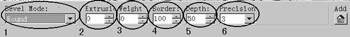 在选择了总的斜面类型后,还可以在区域2、4和5分别调整挤出、边缘和深度数值,创造出比缺省效果更深或更浅的斜面。在区域3可以调整3D特效字的粗细。至于区域6则是调整斜面效果的光滑程度,数值越高越光滑,不过渲染、显示速度也越慢。