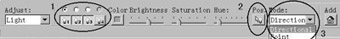 图7是光线的属性工具栏,除了光线的色彩可以进行颜色、亮度、饱和度和色调的调整外,还可以调整光源的位置。COOL 3D 2.5提供了4个光源分别从四个方向照射3D对象,在区域1中你可以任意打开或关闭这些光源,1号光源是主光源,一般不要关闭,否则将造成3D对象过于暗淡。在区域2中你可以调整4个光源的照射角度,先在区域1中选择要调整的光源,然后按下区域2中的按钮,在文档区域鼠标按钮变成小灯泡状,按住鼠标左键拖动则可以调整该光源的照射角度和位置。在区域3可以调整光源模式,光源模式分为直射光和散射光。散射光指的是从3D对象周围的一个固定点发射的、强度不变的光线,随着光源位置的变化,3D物体的不同区域会变亮或变暗。直射光指的是类似于太阳光的、强度可变的散射光线,随着光源与3D对象距离的变化,3D物体受光源的照射减少,整体变得暗淡。