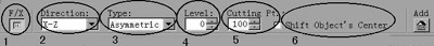 图16是对象扭曲特效(Twist)的属性工具栏。与歪斜特效的区别在于,扭曲特效是3D对象发生“拧麻花”的动作,而歪斜特效则是3D对象向一方倾斜变形。按区域1的扭曲方式(Type)不同而分为两种工具栏。当扭曲方式为不对称扭曲(Asymmetric)、仅左方扭曲(Left Only)或仅右方扭曲(Right Only)时显示的是第一行所示的属性工具栏。区域2扭曲轴线(Axis)设定3D对象是在X、Y或是Z轴上发生扭曲。一般在文字横排的时候不要选择沿Y轴扭曲,而文字竖排时不要选择沿X轴扭曲,这都会造成3D对象严重变形而难以辨认。区域3扭曲角度(Skew Angle)决定3D对象发生多大角度的扭曲,取值范围是-360到360。