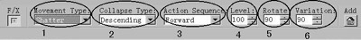 第六行工具栏是运动方式为铁饼投掷(Sling)时的属性工具栏。此运动方式模拟铁饼运动员投掷铁饼的动作,先将3D对象加速旋转,最后从右方甩出。区域14长度(Length)决定3D对象整个动作的范围大小。区域15圈数(Round)设定3D对象加速旋转的圈数,每100增量为1圈,有正反旋转(正负数值)之分。区域16甩出点(Throw)设定3D对象在旋转到什么位置时被甩出,例如,数值0表示不发生旋转而直接甩出,数值90表示旋转到第一个半圈时被甩出,此数值要注意与圈数相配合,如果大于圈数则3D对象不会被甩出,小于圈数太多又会造成在完成被指定的旋转圈数之前就早早被甩出。区域17设定整个动作是在水平方向(Horizontal)还是在垂直方向(Vertical)被完成。