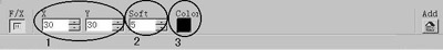 图18是阴影特效(Shadow)的属性工具栏,区域1是设定阴影相对于3D对象的位置,用X、Y轴的数值来表示,可以作用于关键帧,如果动画过程中不同帧的此数值不同,则阴影的位置就在动画中发生位移。区域2是阴影柔化属性(Soft),也叫羽化(Feathering),用于设定阴影边缘的柔化效果,取值范围0到100,数值越大则边缘模糊效果越浓。此属性同样可以作用于关键帧,在不同的帧使用不同的数值,可以制造出阴影渐渐清晰或模糊淡化的动画效果。区域3是阴影颜色属性(Color),单击颜色方格会弹出标准的Windows颜色选择框,此属性可以作用于关键帧,在不同的帧使用不同的颜色,可以制造出阴影变色的动画效果。