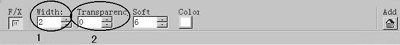 图19是发光特效(Glow)的属性工具栏。此工具栏有着与阴影特效工具栏一样的柔化属性(Soft)和颜色属性(Color)。除此之外,区域1是光带宽度属性(Width),此属性可以作用于关键帧,使用这一特点可以制造霓虹灯闪烁的效果:将第1帧的光带宽度设定为0,将下一帧的宽度设定为大于0的一个数值,再下一帧再设定为0,如此反复操作则可以产生灯光闪烁的动画效果。区域2是透明度属性(Transparency),设定光线的透明程度,取值范围为0到100,取值为100时光线消失,此属性可以作用于关键帧,可以制作出光线逐渐变得透明的动画效果。