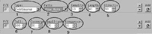 第二行工具栏是运动方式为波纹(Ripple)时的属性工具栏。区域6的两个选项分别用于选择波纹的振频(Frequency)和振幅(Amplitude),这两个选项的作用前面的介绍中也曾经提到过。区域7的级别(Level)属性用于决定波纹的半径。区域8的波心属性(Hit Point)用于确定波纹扩散的中心点。