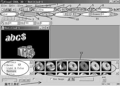 COOL 3D 2.5为所有特效种类增加了或简单或复杂的“属性工具栏”,选择“查看(View)”菜单,选中属性工具栏这一项,或是按下图1区域5中右边的按钮,在画面下方状态栏上面就会显示属性工具栏,下面介绍在每一种特效中属性工具栏所显示的特性。