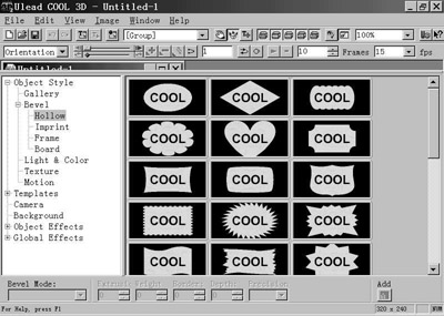 所有的3D对象刚刚显示时都是土灰色色彩,不包括任何动画特效,你可以在此基础上添加各种特效。一般来说,先从对象风格(Object Style)这一大类开始,首先是图库特效(Gallery)。COOL 3D 2.5提供了十几种图库可供选择,所谓图库就是COOL 3D 2.5预先设置好的一些光影、斜面、表面色彩和材质的组合,在后面介绍的操作中你可以向图库中添加自己的个性组合。在图库中有几种特效是动画效果的,如果你制作静态3D对象时选择了它们,则显示的只是动画效果中的第一帧。