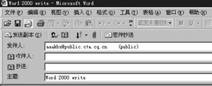 在Word 2000编辑状态下,单击常用工具栏上的电子邮件按钮 ,窗口变成发送邮件时的界面(图4),此时还没有打开Outlook Express程序。在“收件人”栏中填上欲发往的