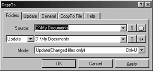 对文件进行同步,是Copy To的最主要用途。操作前应选定源文件夹和目标文件夹,并设定操作方式为Update(更新)。再打开Mode下拉列表,选中Synchronize(Backup and delete extra files on target)项,单击“OK”或“Apply”按钮。此后会弹出一个窗口,显示两个文件夹中文件复制的方向,单击“OK”按钮开始同步,其间可以显示同步进度。同步结束后会出现一个文本格式的清单(也可在Update选项卡中使用Options按钮取消这一功能),告诉你文件夹同步的细节。